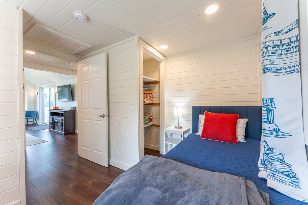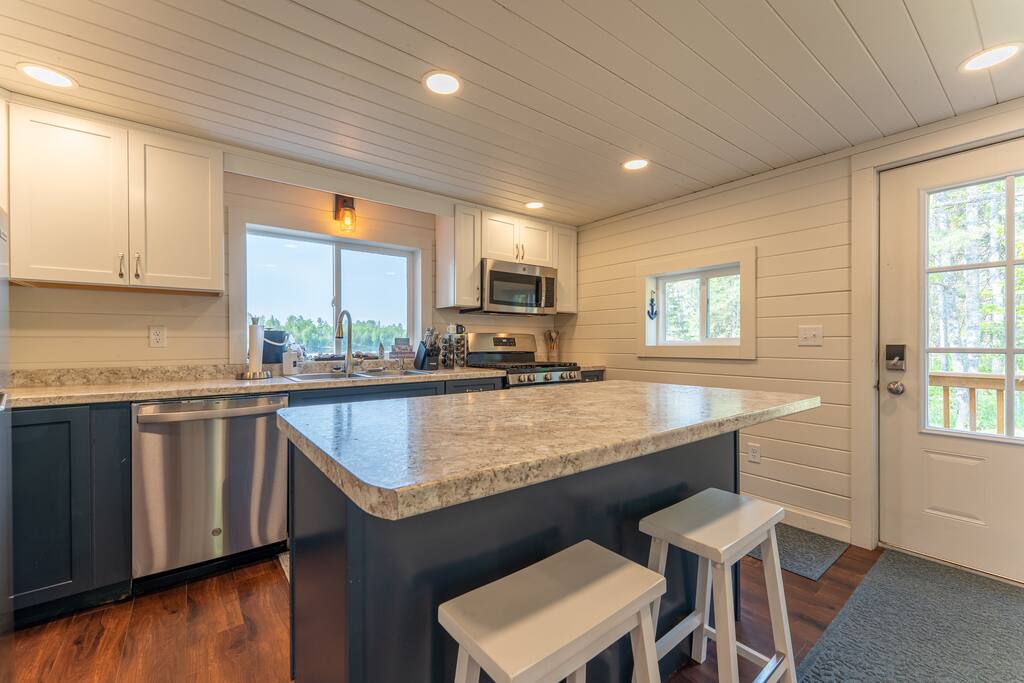 On a sandy shoreline, the property is uniquely flat, allowing for ease of access during all seasons. The elegant, yet comfortable home is approximately 1000 sq ft and includes 2 bedrooms, a dining table for 4, modern shower, and a large sectional couch. The east bedroom is larger and has a queen bed. The west bedroom is smaller and has two twin beds. The living room has a large sectional couch. We supply all your basic kitchen needs, linens, extra blankets/pillows, towels, and basic toilet items. You will fall in love with the landscaping, docks, beach and outdoor patio. There is a patio table, grill, and several Adirondack chairs outside for your enjoyment. The lake is clear and shallow even quite a distance out from the shore. We will leave you a list of local spots we like to visit on the lake, as well as a map to the snowmobile trail. This was a year round private residence, so it well maintained and comfortable.